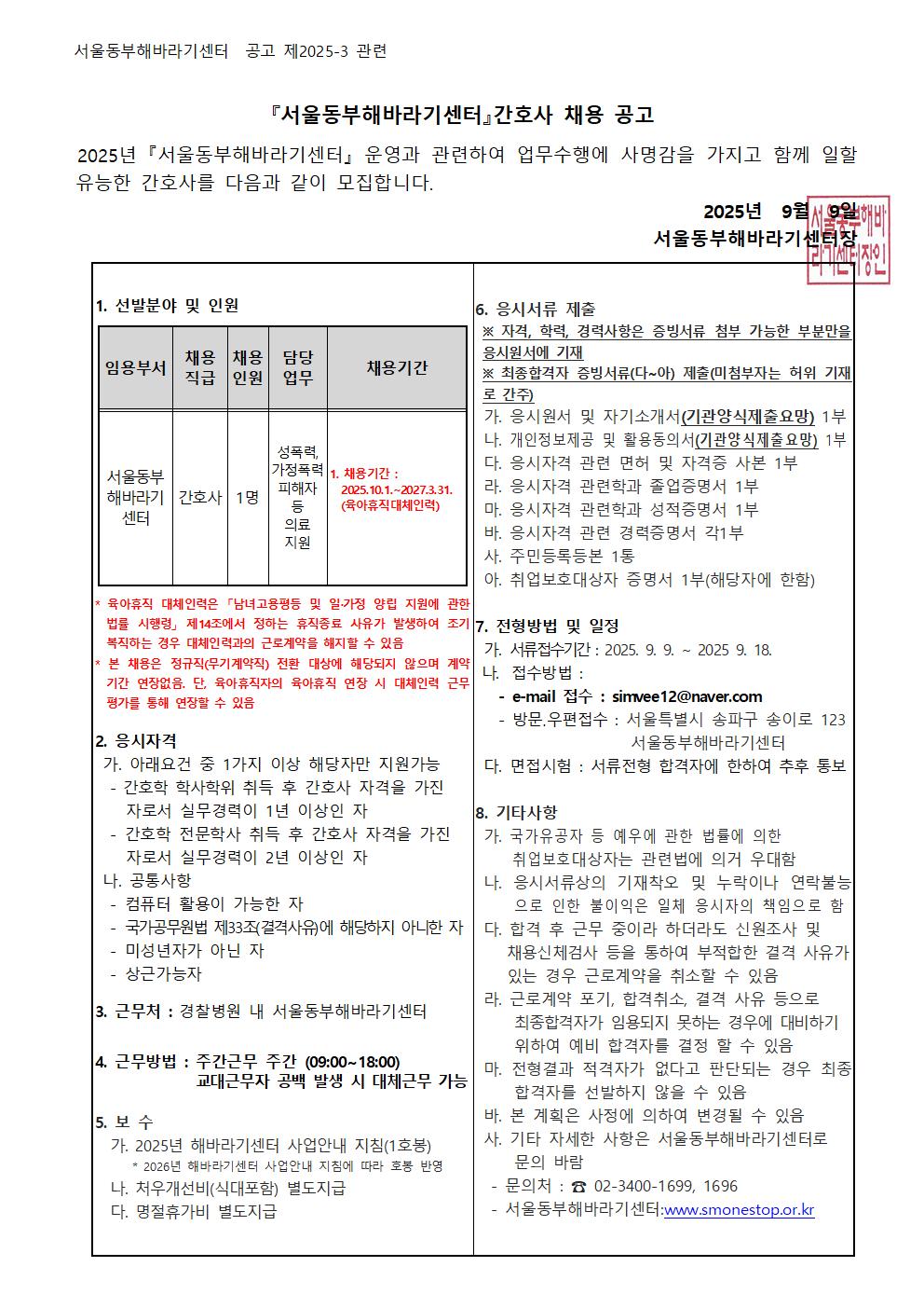 | [2025-03호] 서울동부해바라기센터 직원(주간 간호사_육아휴직대체인력) 채용 공고 | |||