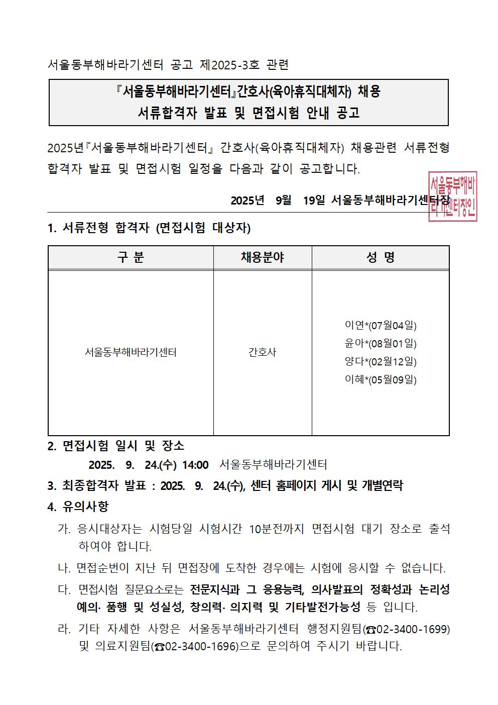 [2025-03호] 간호사(육아휴직대체자) 서류 합격자 발표 및 면접시험 안내