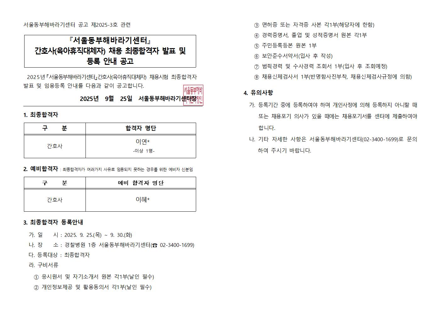 [2025-03호] 간호사(육아휴직대체자) 최종합격자 발표
