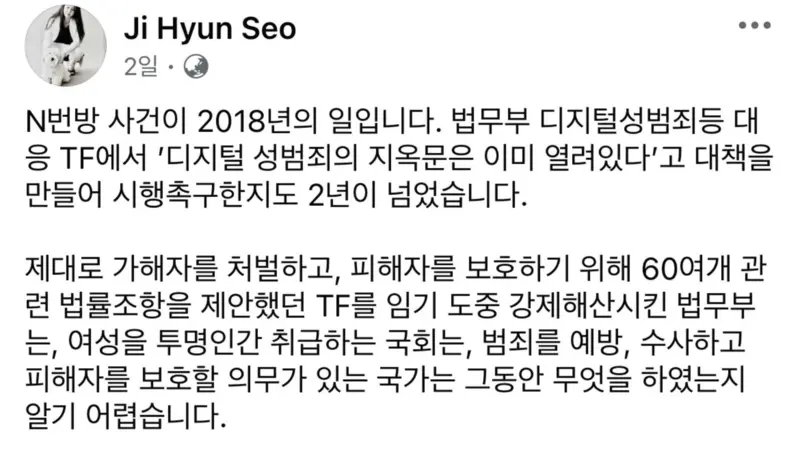 D씨는 N번방 사건 이후인 2020년도에 만들어진 법무부 디지털성범죄 TF에서 “이미 이런 사태를 예상하고 관련 법제의 보완 등이 필요하다고 지속적으로 지적해왔지만 상당수 반영되지 않았다”고 지적했다.