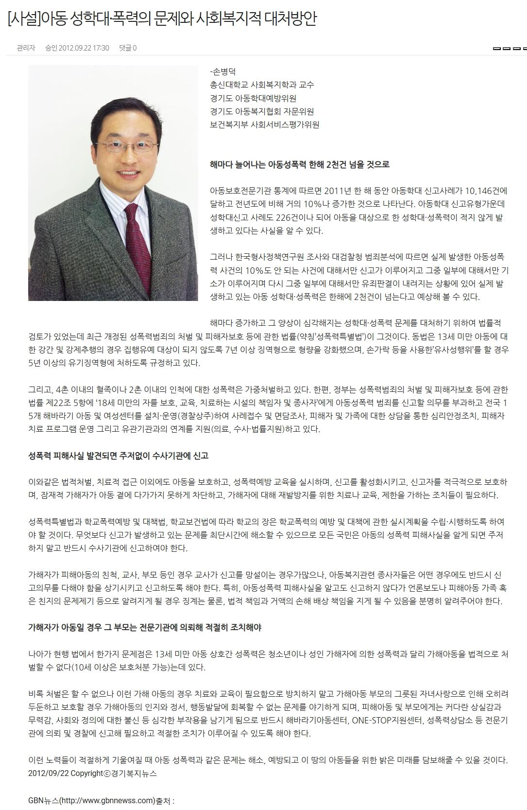 [사설]아동 성학대·폭력의 문제와 사회복지적 대처방안