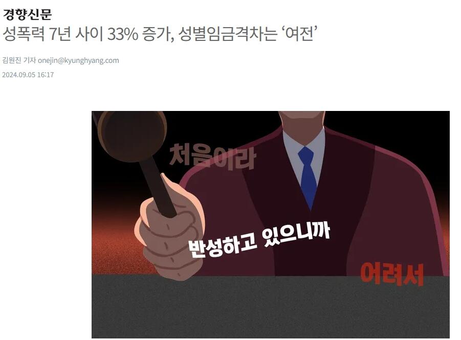 성폭력 범죄는 전반적으로 증가하는 추세에 있다. 성폭력 발생 건수는 2022년 4만515건으로 2015년(3만560건) 대비 32.6% 증가했다. 강간 피해자는 2017년 5223명에서 2022년 5467명으로 늘었다. 이중 여성 피해자가 99.3%로 사실상 전부에 가깝다. 유사강간 피해자도 2017년 636명에서 2022년 947명으로 증가했다. 교제폭력 범죄자 수는 2017년 1만1380명에서 2022년 1만2828명으로 12.7% 늘었다.